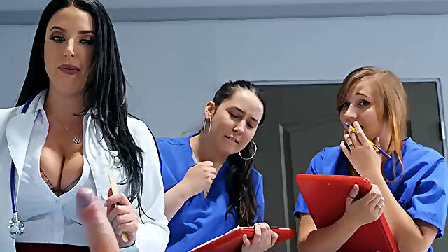 Two cute nurses, including the petite Reese Robbins, having a threesome in the doctor's office