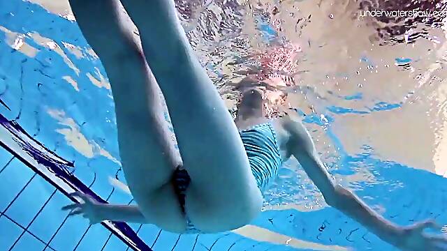 Elegant and supple sweetheart, swimming underwater in the outdoor swimming pool. three two