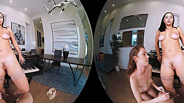 Cute college girls share tasty dick in home POV threesome