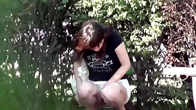 Voyeur is watching upskirt. A girl sits in nature and sometimes spreads her legs, showing panties or a hairy cunt.